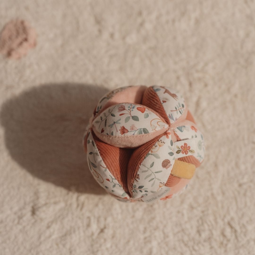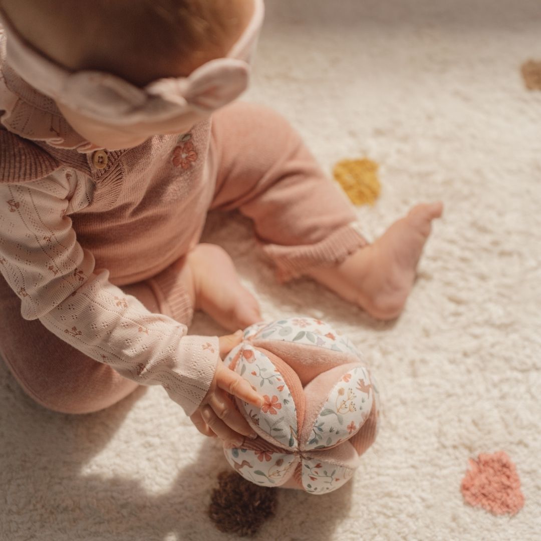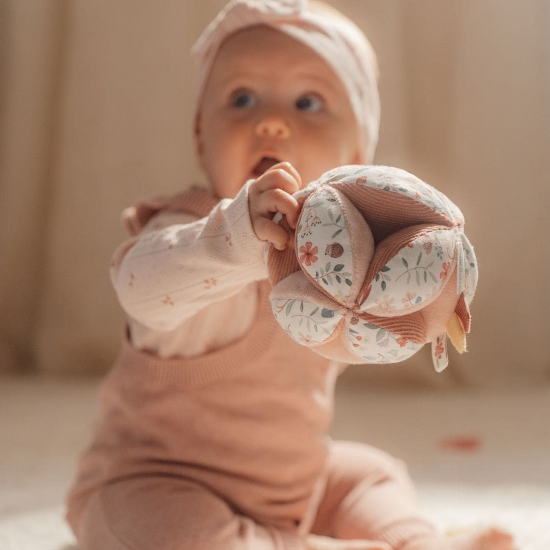 Probeer de bal maar te pakken! Deze grijpbal met zijn interessante vorm zorgt voor een geweldige uitdaging voor je kleintje. De vlakken van verschillende texturen en patronen nodigen uit om te grijpen en te verkennen. De bal is gemakkelijk op te pakken voor kleine handjes en het vrolijke geluid van het rammelende belletje beloont je baby’s inspanning. Op het lichtblauwe decor van Fairy Garden zullen de makkelijk vast te pakken knopen en verschillende leuke labels de zintuigen prikkelen, grip ontwikkelen en je baby flink bezig houden in de box.
