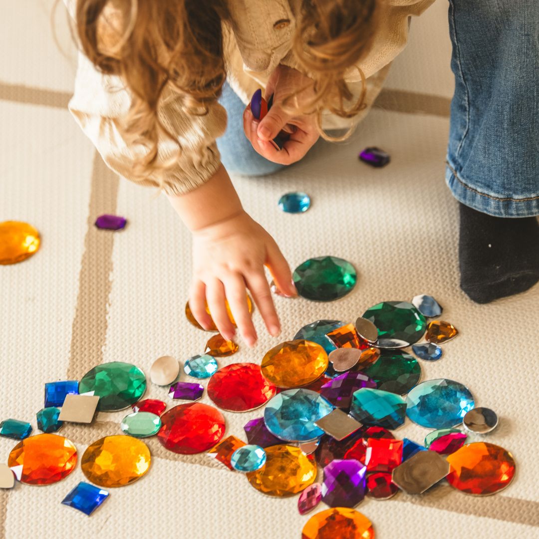 Deze set met 60 grote glitterstenen in 12 verschillende kleuren nodigt gelijk uit tot spel. Je zult zien dat je kind van alles bedenkt met dit open einde-speelgoed. De glitterstenen hebben een prachtige fonkeling. De stenen zijn perfect te combineren met houten blokken, in het keukentje als etenswaren of in kinetisch zand.