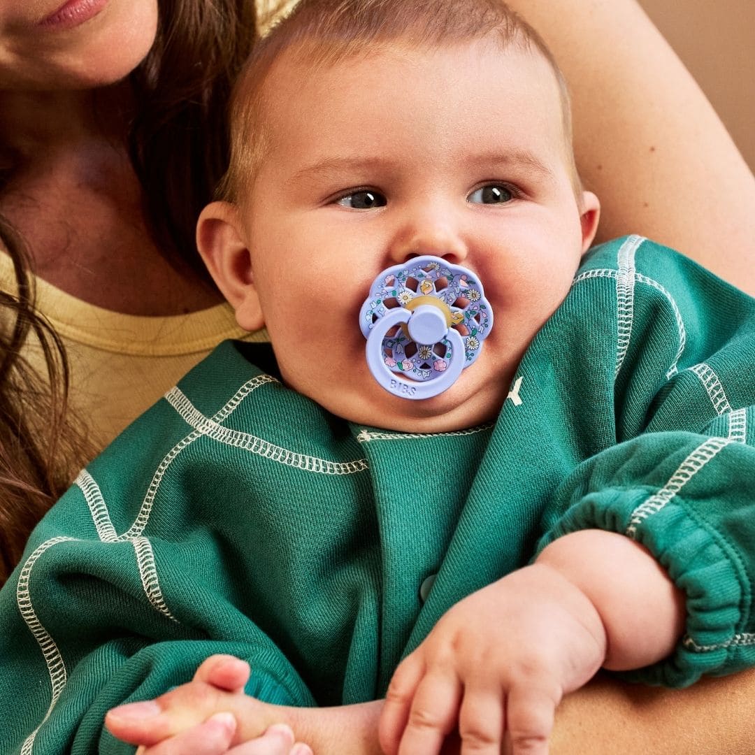 De BIBS Boheme speen heeft een bloemvormig schild met een supermooi geperforeerd patroon. Deze extra ventilatiegaten voorkomen irritatie van de gevoelige huid rondom de mond.