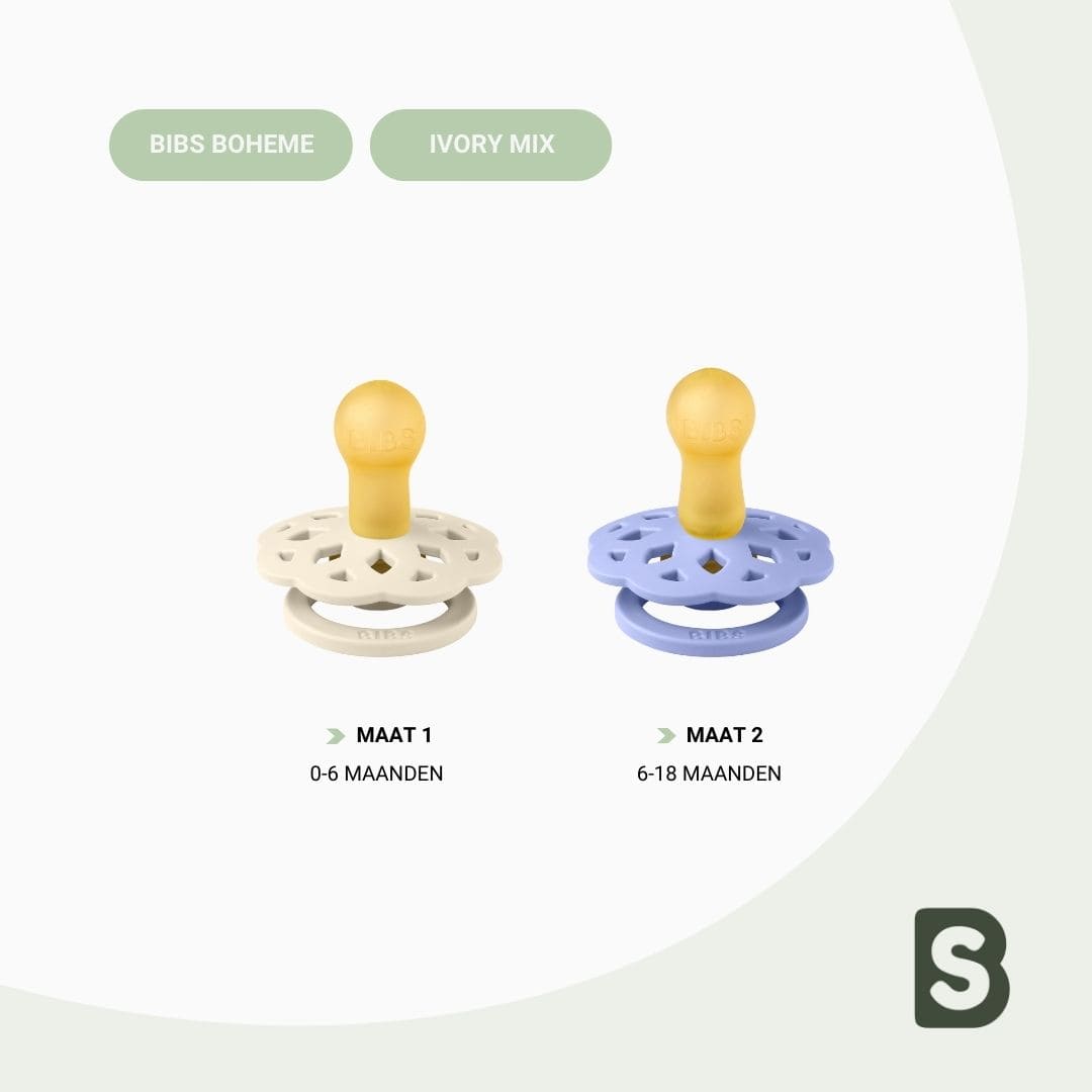 De BIBS Boheme fopspenen zijn verkrijgbaar in twee maten;