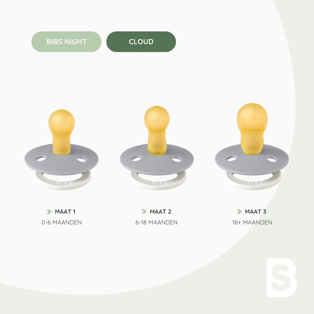 De BIBS Colour night ronde fopspenen zijn verkrijgbaar in drie maten;