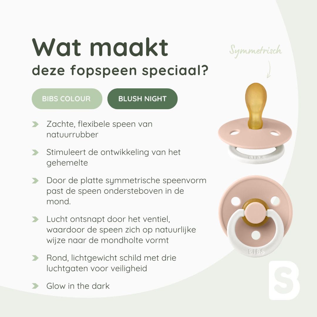 Deze BIBS Colour speen in de oudroze kleur – blush - wordt dé nieuwe lievelingsspeen van je kindje. Door de glow in the dark ring vind jij of je kindje de speen gemakkelijk terug in het donker. De symmetrische speen heeft een platte basis en het uiteinde van het natuurrubberen zuigdeel is rond en ovaal. Door de symmetrische speenvorm ligt de tong plat in het mondje van je baby en drukt de speen plat tegen het gehemelte waardoor je kindje niet zo hard hoeft te zuigen. De fopspeen bevredigt de zuigbehoefte van je kindje, biedt troost én kalmeert.