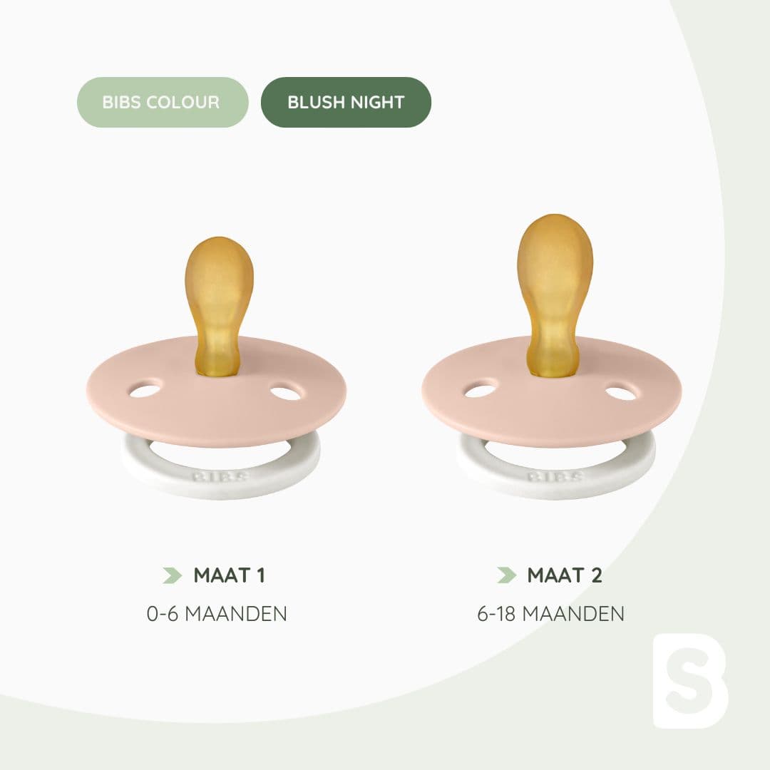 De BIBS Colour night symmetrische fopspenen zijn verkrijgbaar in twee maten;