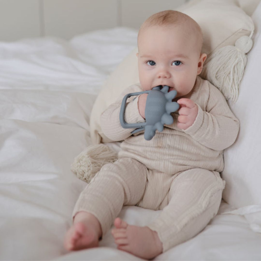 De No-Drop Sensory Teether van Mushie is speciaal ontworpen om de fijne motoriek van je baby te stimuleren en de sensorische ontwikkeling te ondersteunen. Dit Mushie-bijtspeeltje helpt bij doorkomende tandjes door het pijnlijke tandvlees te verzachten én biedt een fijne afleiding.