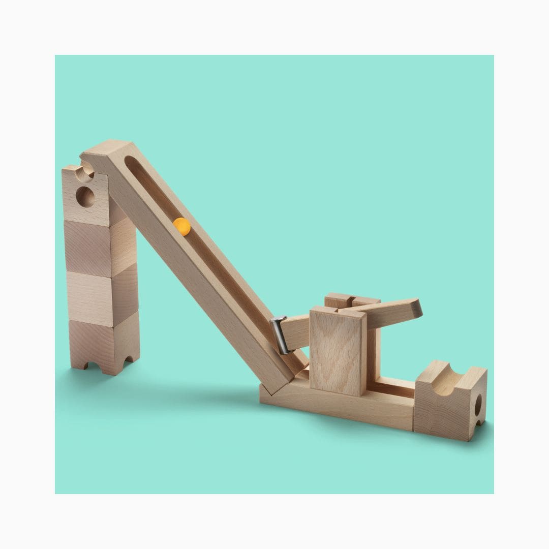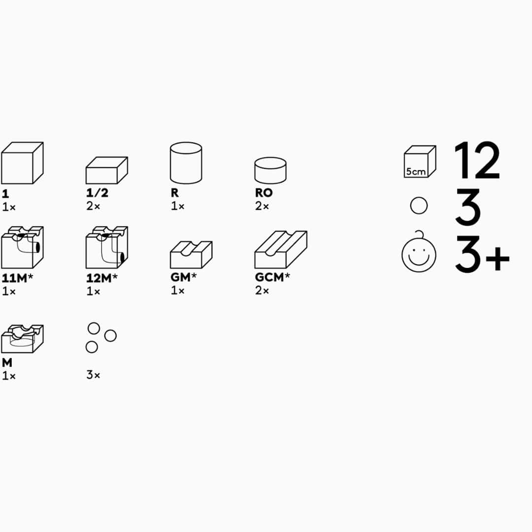 - Inhoud verpakking: 12 bouwelementen en 3 knikkers