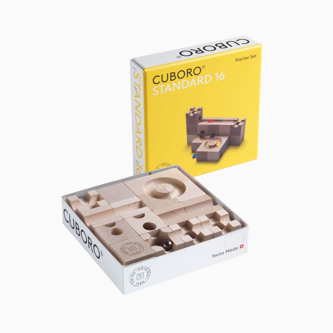 De CUBORO STANDARD 16 is de perfecte starter set voor kinderen vanaf 5 jaar. Met de houten kubussen en rails maak je de mooiste knikkerbanen. Knikkers die naar beneden rollen en dan ontdekken wat er gebeurt, is fascinerend voor kinderen. De 16 houten elementen dagen jou en je kind uit om logisch na te denken en te experimenteren. Zodra de knikkerbaan eenmaal staat, heb je een waar spektakelstuk staan. Knikkerbaan klaar? Knikkeren maar!