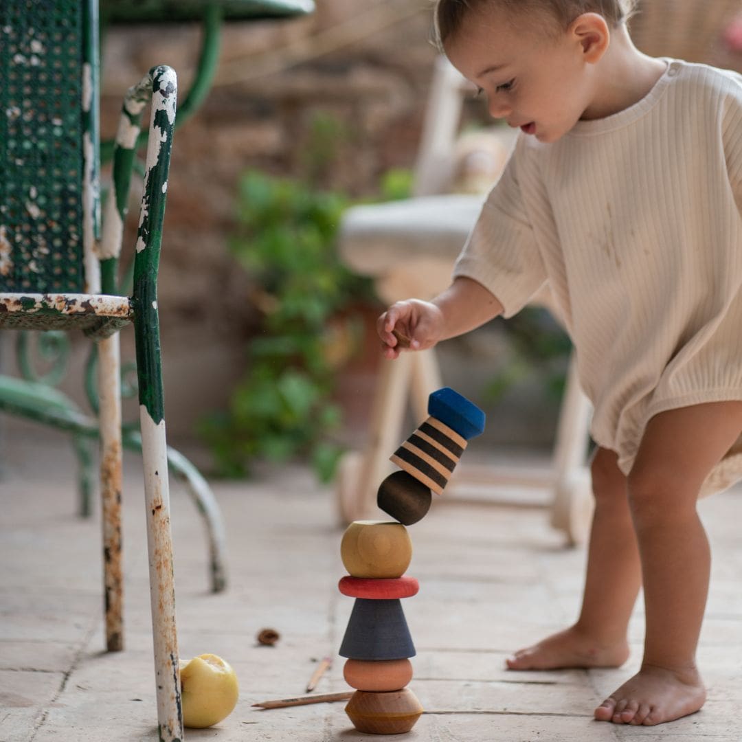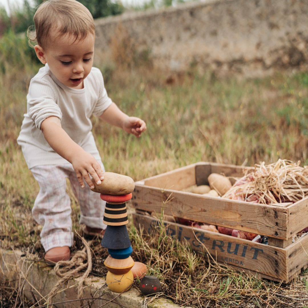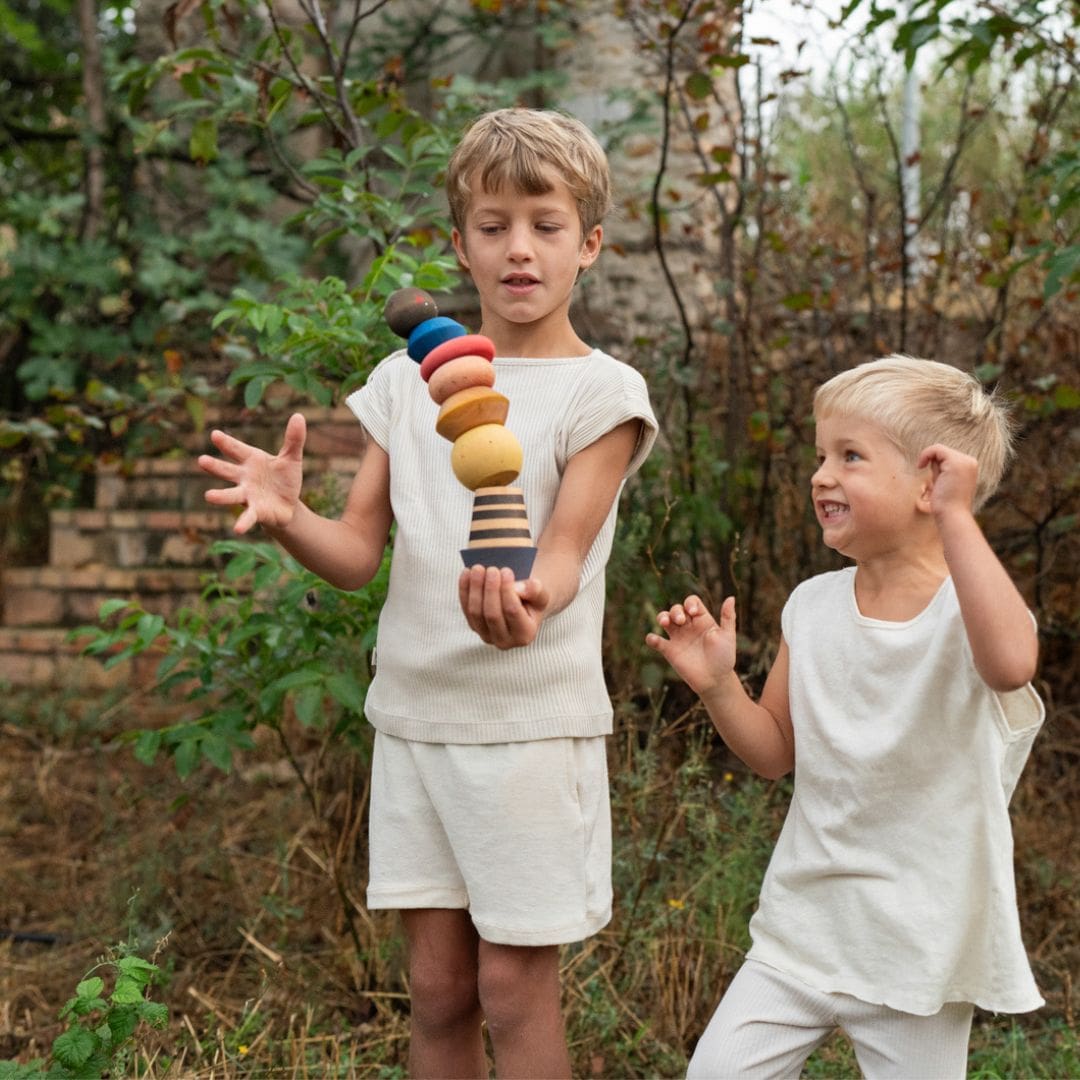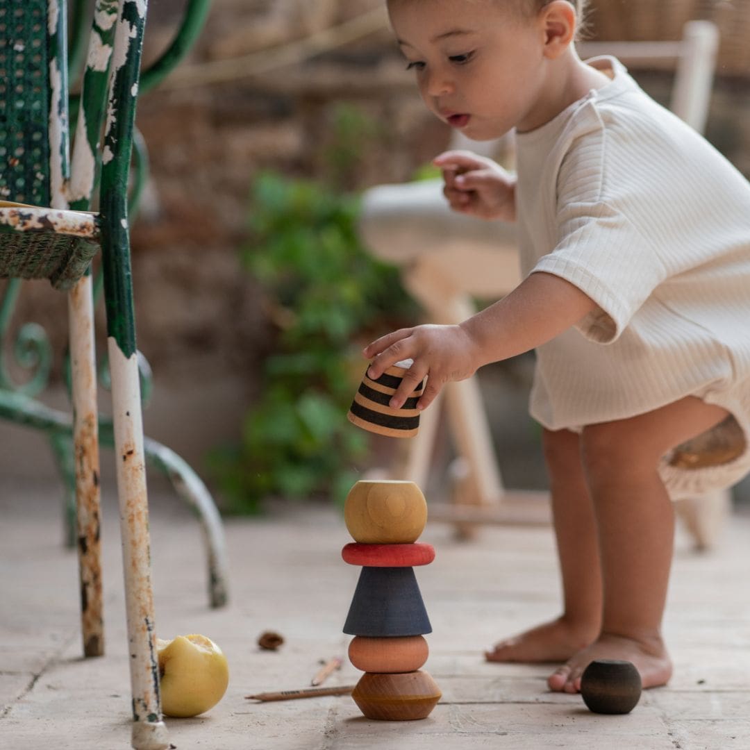 Deze houten stapeltoren van Grapat bestaat uit 8 onderdelen met een ander formaat en vorm waarmee kinderen kunnen oefenen met stapelen. Ook nodigt dit open einde speelgoed uit om zelf allerlei spellen mee te verzinnen.