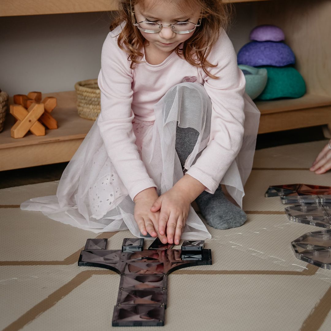 Speeltip! De wegenset van CONNETIX combineert perfect met andere magnetische tegels, zoals de Rectangle en Shape packs. Zo creeër je eigen small world play-setting met bijvoorbeeld houten voertuigen, houten dieren, gebouwen en meer.