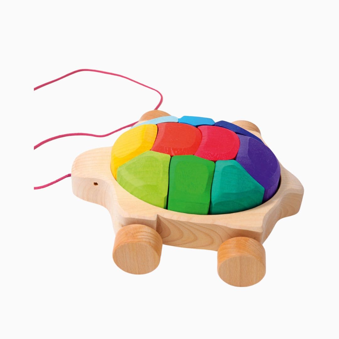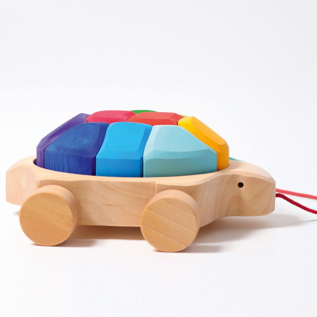 Deze schildpad is dit niet zomaar een trekdier – het is een trekdier en blokkenset in één. Met de blokken kun je bouwen en puzzelen. Dit open-einde-speelgoed laat ruimte voor eigen invulling, en dat maakt het spel rijk en steeds weer anders.