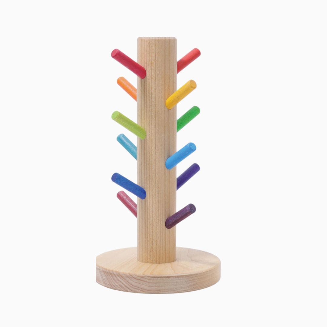 Ontdek de vele spelmogelijkheden van het regenboog bos van Grimm's. De set bestaat uit 12 kegels in verschillende grote in regenboogkleuren. Leuk om neer te zetten, te gebruiken bij het maken van mandala's of om kastelen of droompaleizen mee te maken in combinatie met andere houten blokken.