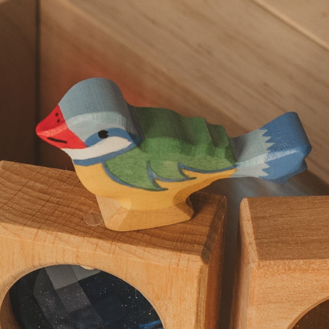 Houten pimpelmees van Holztiger. De pimpelmees is makkelijk vast te pakken en prikkelt de fantasie van je kind.