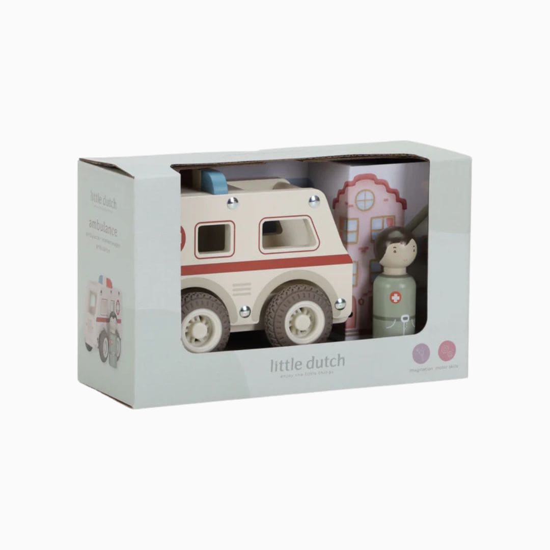 Sirene aan en racen maar! Met deze stoere houten ambulance van Little Dutch komen kleine hulpverleners altijd op tijd.