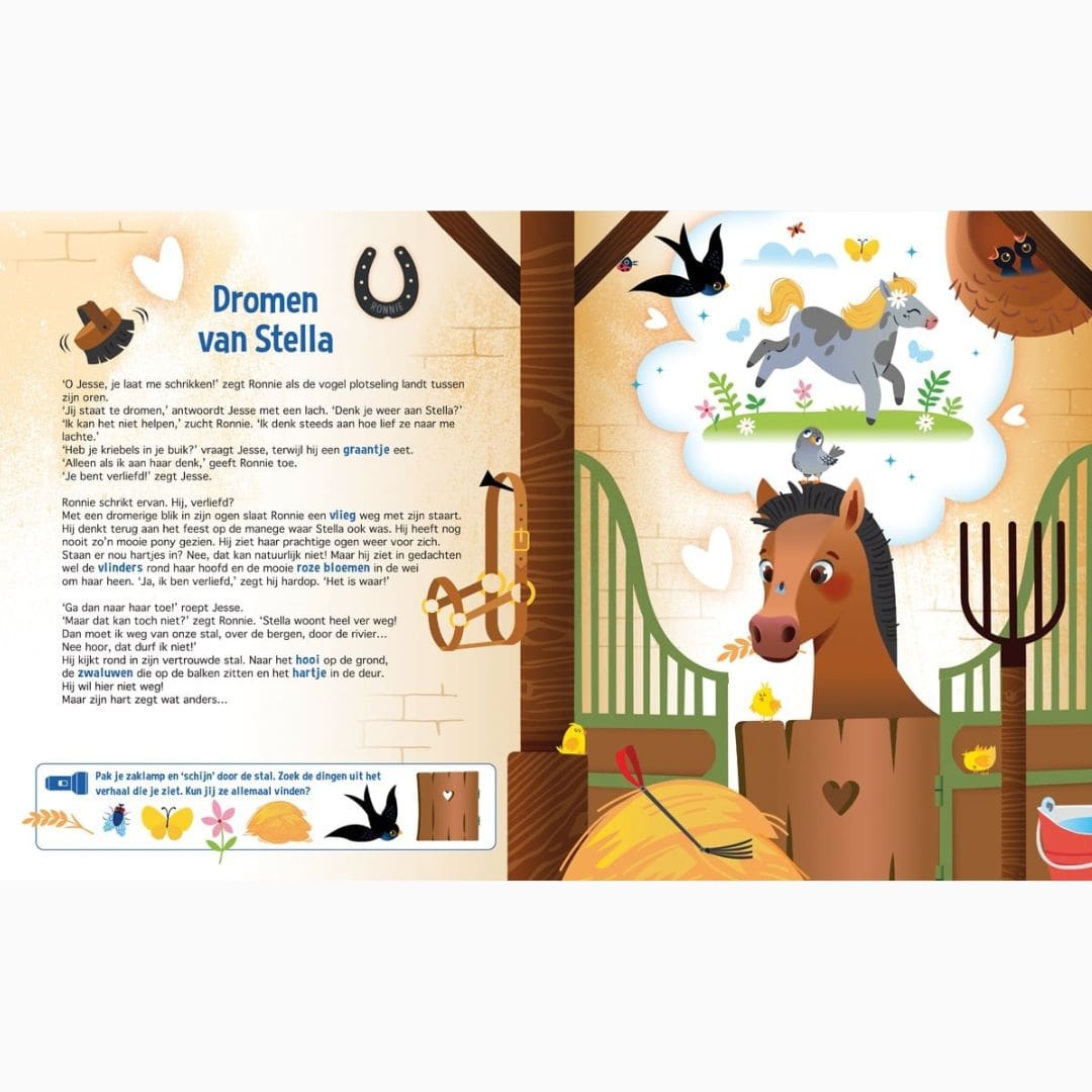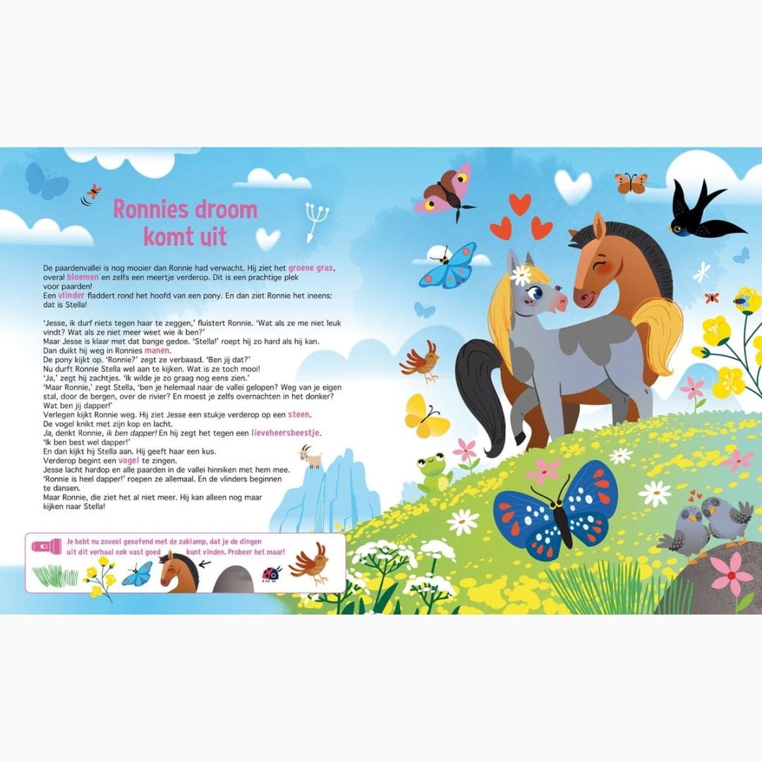In het zoekboek Speuren naar paarden heeft je kind de zaklamp altijd bij de hand. Op de linker pagina staat een verhaal vol met dikgedrukte woorden. Je kind kan vervolgens met de zaklamp de dingen zoeken waar die woorden voor staan. De rechter pagina is nog donker. Maar als je de zaklamp achter de pagina plaatst, ontstaat er een lichtbundel. Zo kun je snel op zoek gaan naar alle plaatjes die bij de dikgedrukte woorden horen. Kan jouw kind alle paarden vinden?
