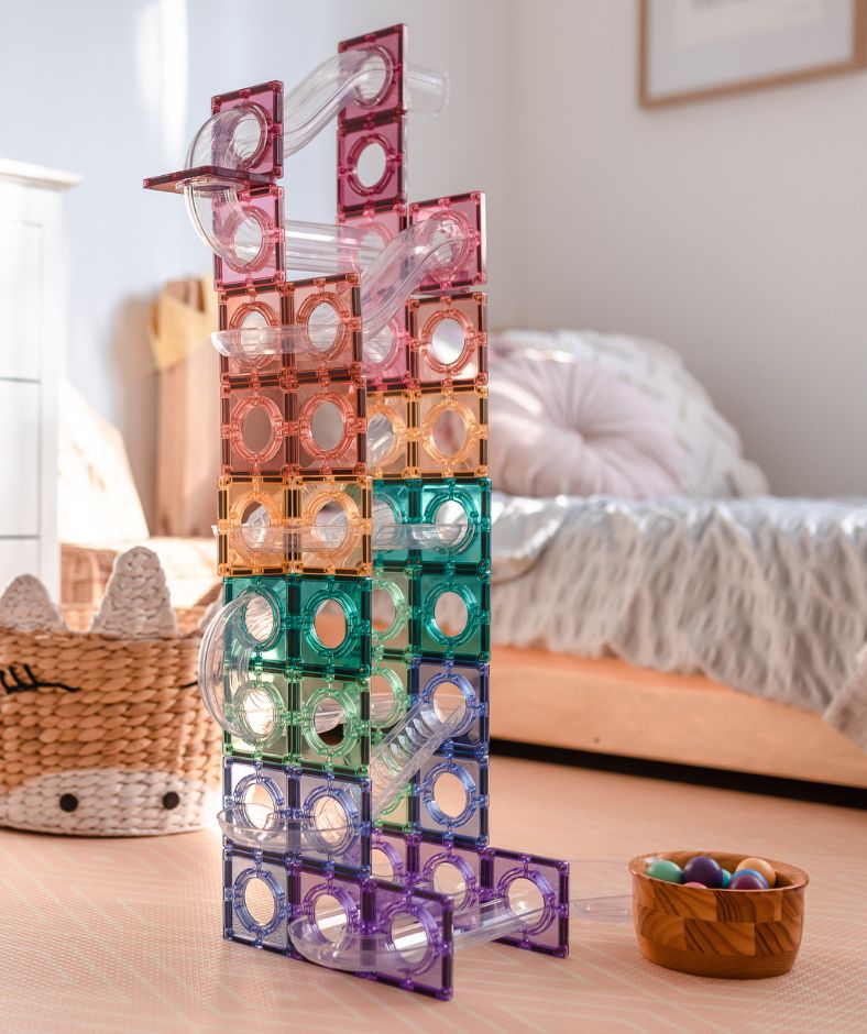 Bij Studio Bambacht vind je de magnetische knikkerbanen van Connetix. De Connetix-knikkerbaan bestaat uit magnetische tegels met een ronde opening in het midden. Daarin kun je de transpartante buizen vastklikken. Dit maakt het makkelijk om spannende bochten en lange afdalingen te bouwen.