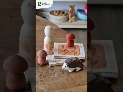 - Inhoud verpakking: 1 Nin poppetje, 1 houten egel speelfiguur, 2 paddenstoelen mandalas en 1 bloemperk met velletjes papier en elastiek