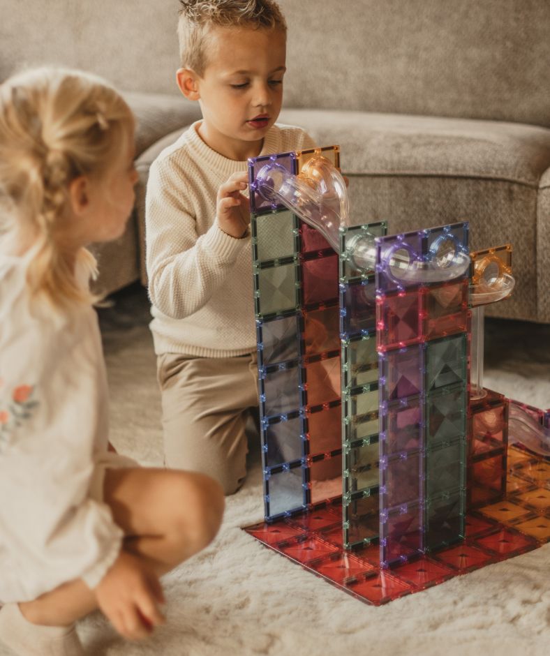Het leuke aan magnetische tegels is dat je er eindeloos veel combinaties en bouwwerken mee kunt maken. Wist je dat de magnetische tegels en de magnetische knikkerbanen ook heel goed te matchen zijn met magnetische tegels van andere merken? Bijvoorbeeld met die van COBLO en Magna Tiles. Als je een paar sets magnetische tegels in huis hebt, raakt je kind al helemaal nooit uitgespeeld. Dan kun je de knikkerbaan zelfs omtoveren tot een nóg hogere toren, een kasteel of een reuze-knikkerparadijs.