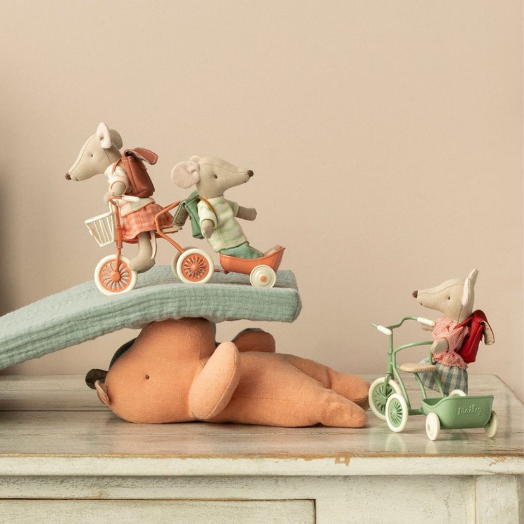 Deze Maileg grote zus muis is dol op fietsen! Het muisje heeft magneetjes in haar handen, zodat zij haar driewieler goed vast kan houden. In haar rugzak neemt de Tricycle muis al haar spulletjes of een lekkere snack voor onderweg mee.