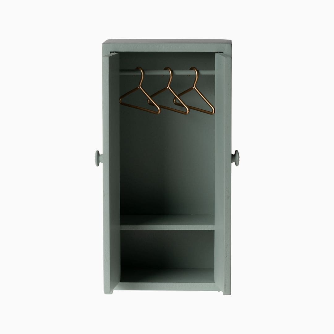 In deze mooie houten kledingkast kunnen de Maileg-muizen hun kleding netjes opbergen. De grijsblauwe kledingkast is mooi afgewerkt en staat prachtig in de slaapkamer. De houten kast wordt geleverd met drie gouden hangers.