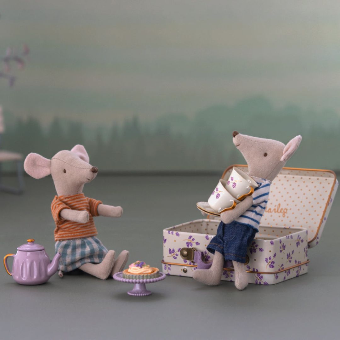 Tijd voor een high tea met de Afternoon treat Purple Madelaine. De Maileg-muizen kunnen gezellig bijkletsen onder het genot van een kopje thee en stukje taart. Leuk voor een picknick in de zomer of in de winter voor de openhaard.