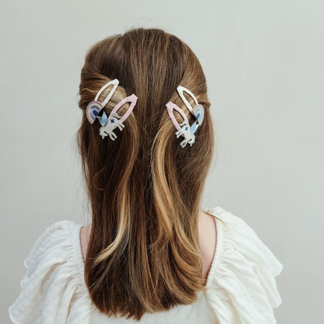 Met deze schattige haarspeldjes van Mimi & Lula steelt je kind overal de show. Deze haarspeldjes fleuren de outfit op en maken de look helemaal af. Deze set bestaat uit vier haarspeldjes met unicorns en regenbogen.