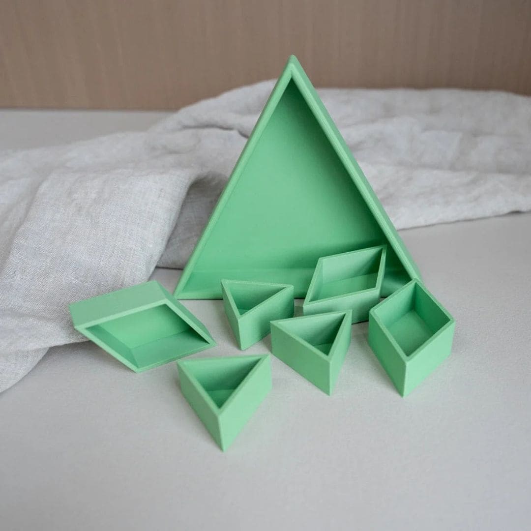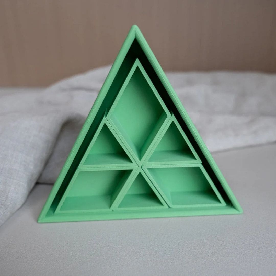 De driehoekige vorm zorgt voor duidelijke, stevige vakjes. Ideaal voor het sorteren van magic sand, speelrijst, kleine accessoires, stekers of mini speelgoed.