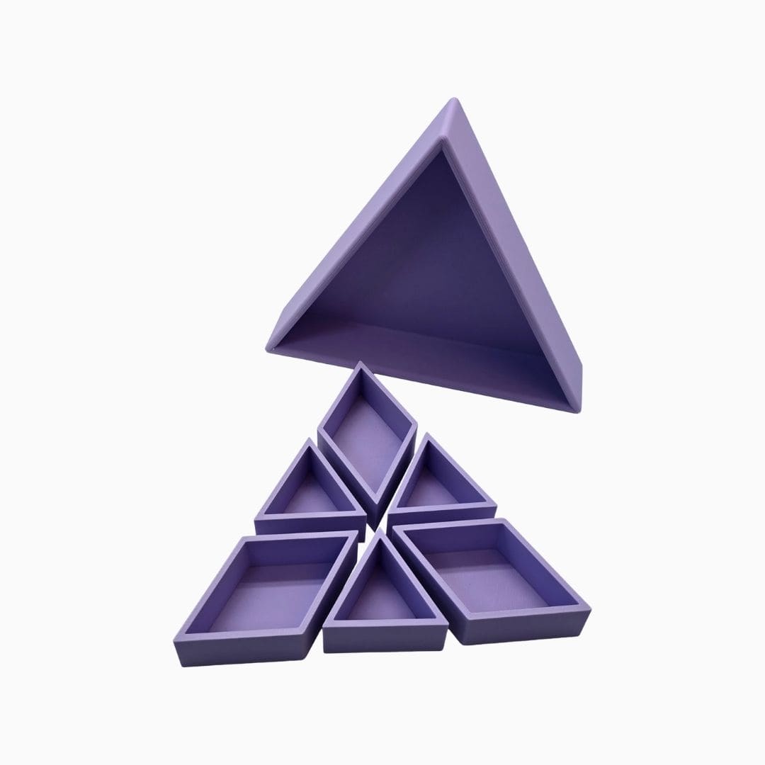 De driehoekige vorm zorgt voor duidelijke, stevige vakjes. Ideaal voor het sorteren van magic sand, speelrijst, kleine accessoires, stekers of mini speelgoed.