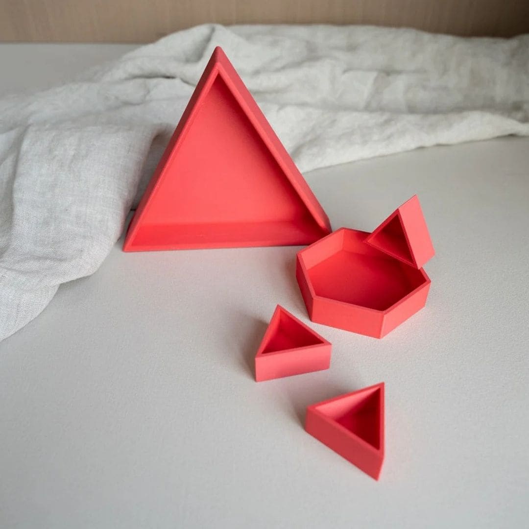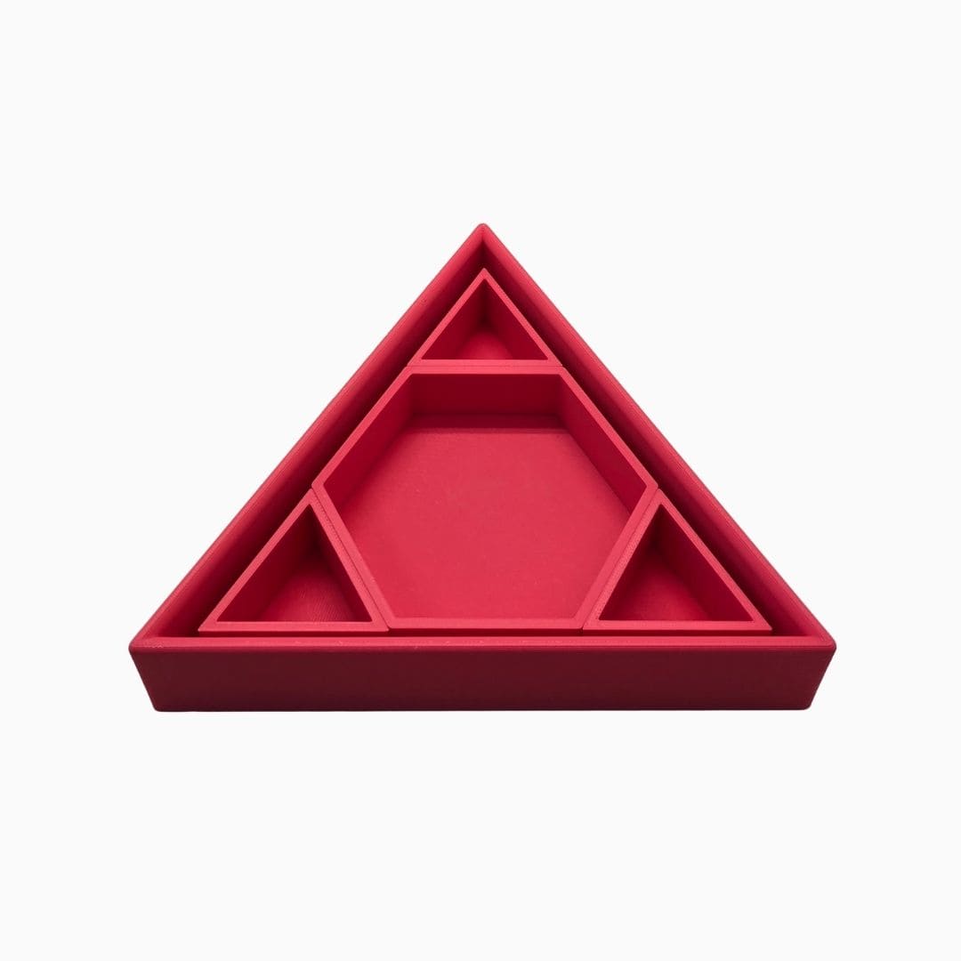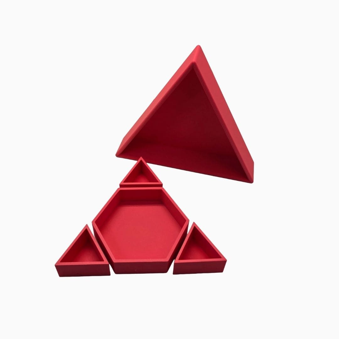 De driehoekige vorm zorgt voor duidelijke, stevige vakjes. Ideaal voor het sorteren van magic sand, speelrijst, kleine accessoires, stekers of mini speelgoed.