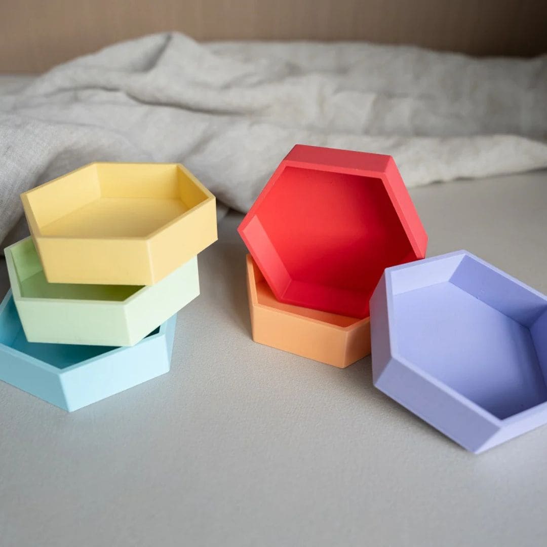 Deze speelbakjes set is een leuke uitbreiding op het magic sand of speelrijst van Grennn. De set bestaat uit zes zeshoeken in vrolijke regenboogkleuren.