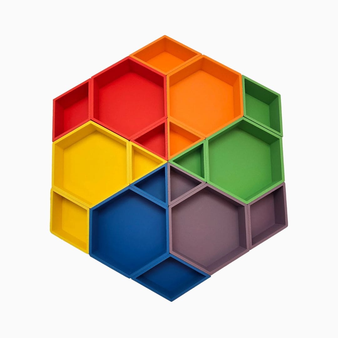 Deze speelbakjes set is een leuke uitbreiding op het magic sand of speelrijst van Grennn. De set bestaat uit 6 zeshoeken, 6 ruiten en 6 gelijkzijdige driehoeken in vrolijke regenboogkleuren.