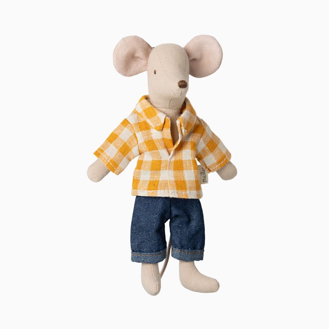 Deze lieve Maileg vader muis draagt een stijlvolle gele geblokte blouse en stoere spijkerbroek. Met zijn vriendelijke uitstraling is hij altijd klaar voor een avontuur of een gezellig moment met de andere Maileg-muizen.