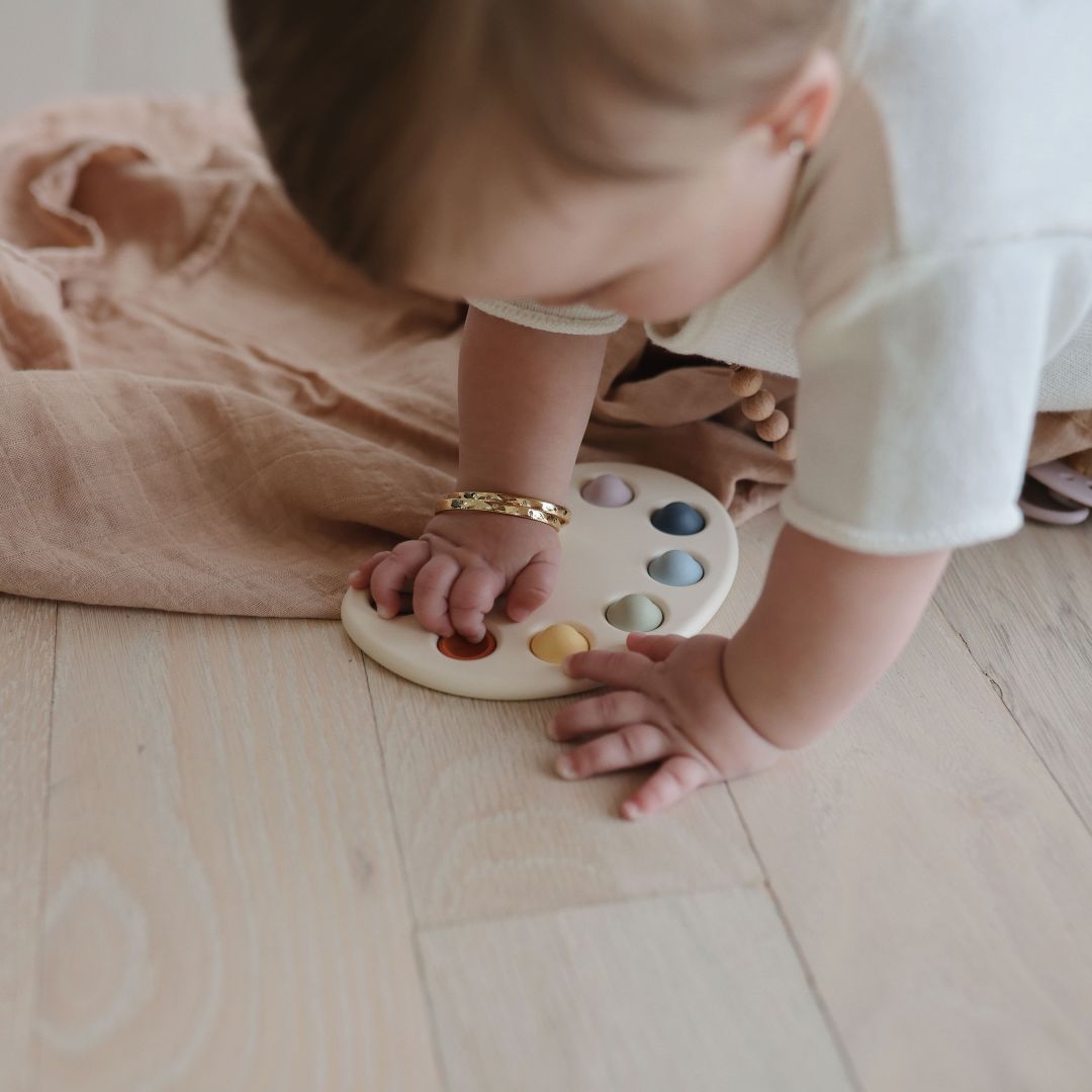 Het fijnste babyspeelgoed voor de allerkleinste handjes. De press toy van Mushie nodigt uit om te grijpen, duwen en “poppen”. Bij het indrukken van de bolletjes hoor je namelijk een pop waar jouw kleintje geen genoeg van zal krijgen. Dit heeft een rustgevende werken. Ideaal om te ontprikkelen. Bovendien stimuleert dit sensorische speelgoed de ontwikkeling van de fijne motoriek van jouw kleintje.