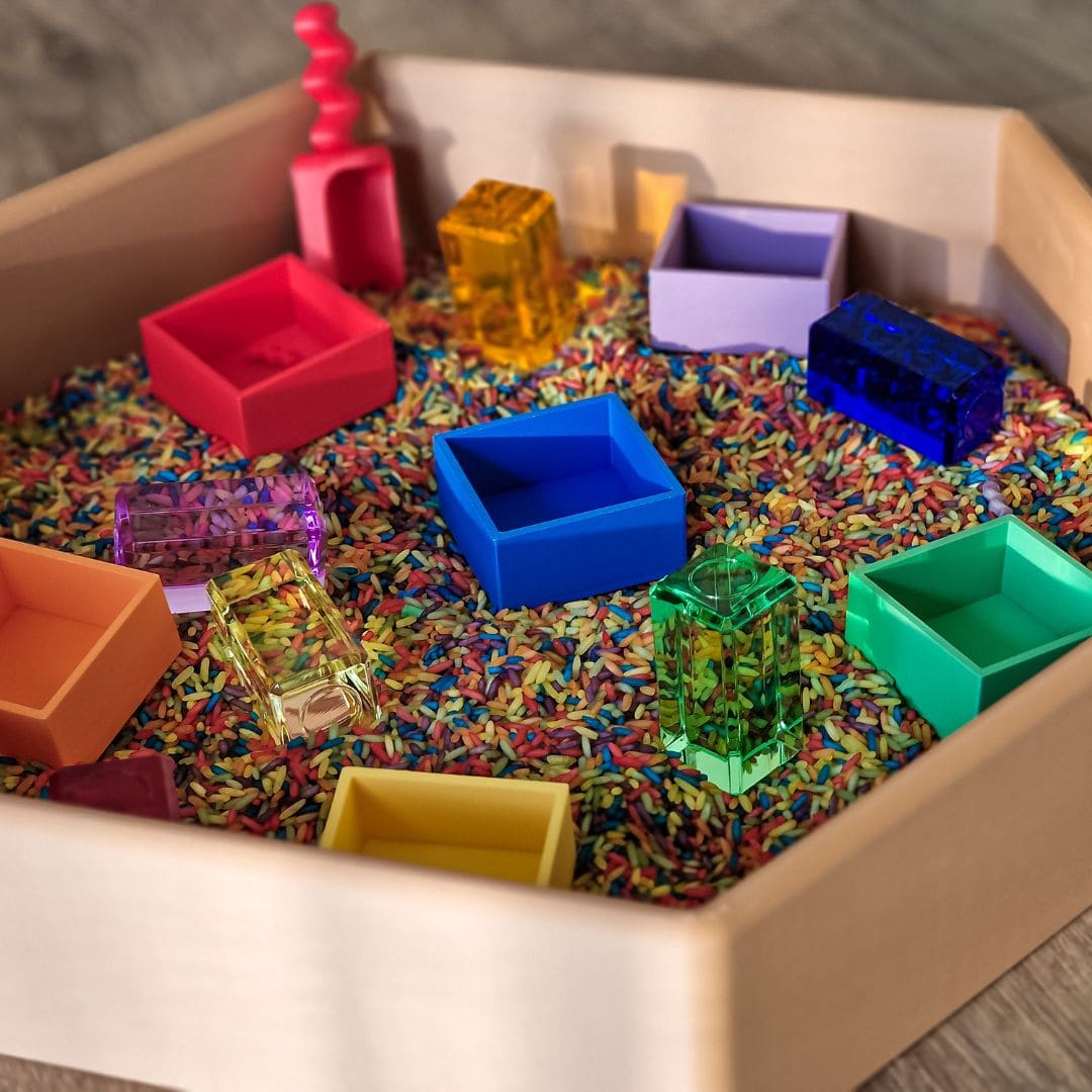 Dit sensorisch speelgoed prikkelt de zintuigen van je kind. Speelrijst heeft een interessante structuur voor kinderen, waardoor kinderen het heerlijk vinden om aan de rijst te voelen en het door hun handen te laten glijden. Dat helpt hen ook bij hun zintuiglijke verwerking.
