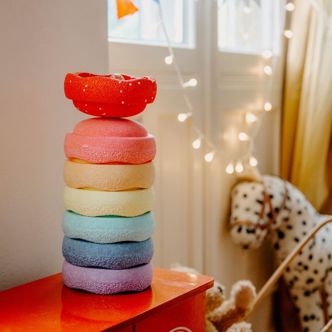 • Inhoud verpakking: 7 mini stapelstenen: violet, blauw, groen, geel, oranje, rood en red sprinkles