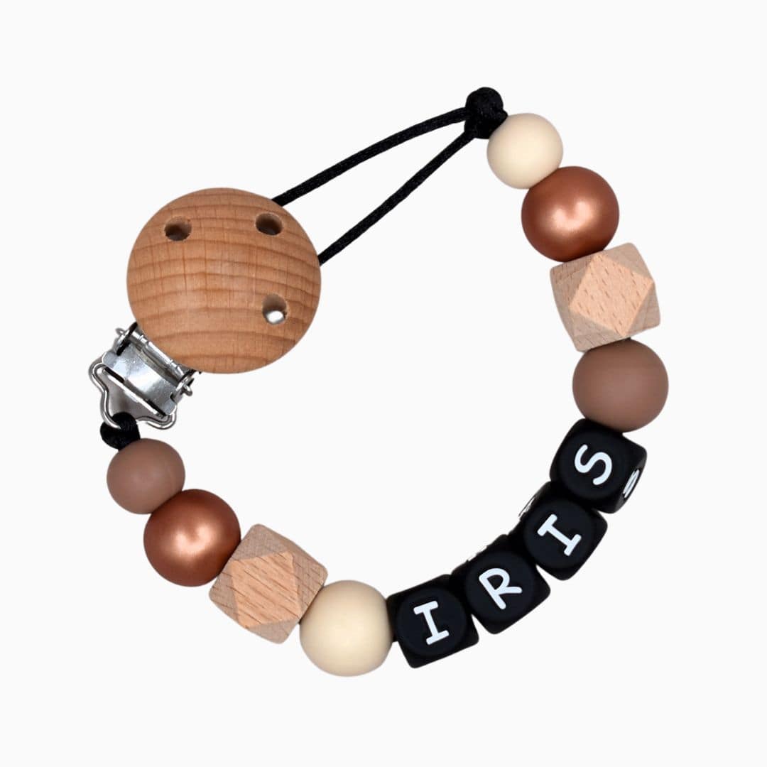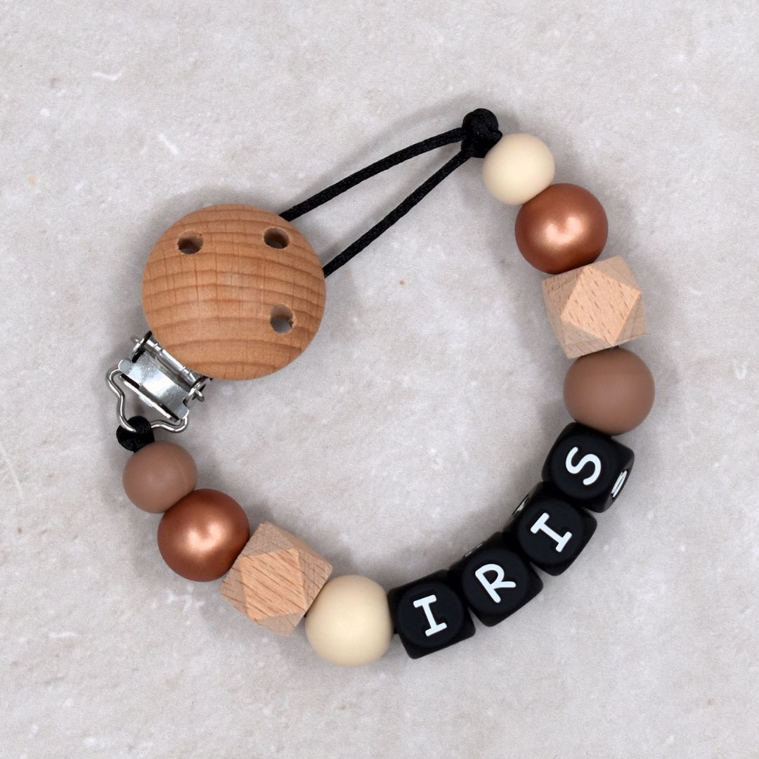 Dit unieke speenkoord is ontworpen én handgemaakt door Iris van Studio Bambacht. Door de trendy mix van beige en brons is dit speenkoord met naam dé finishing touch voor de hippe outfit van je kindje. Super easy vast te maken met clip aan de kleding of kinderwagen. En superhandig, want zo voorkom je dat de fopspeen op de vieze grond valt. Het speenkoord past perfect bij de BIBS speen in de kleur woodchuck en black.