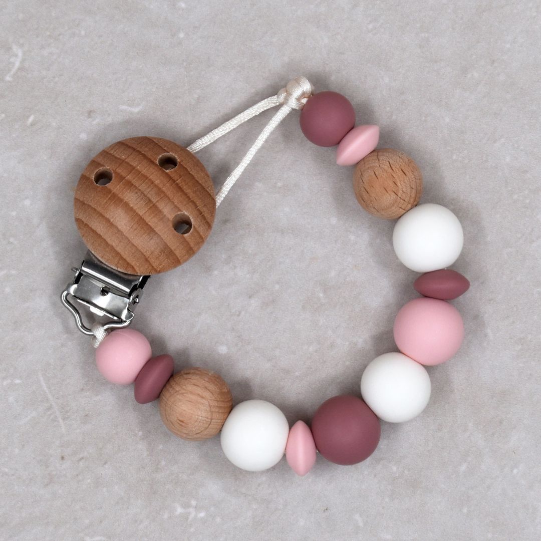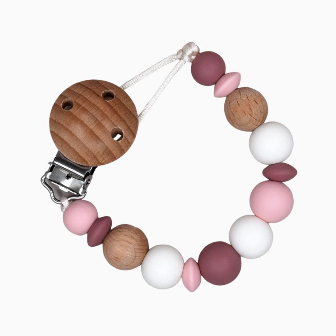 De speenkoorden van Studio Bambacht zijn een echte, stijlvolle musthave voor jouw kleintje. De speenkoorden bestaan uit een mix van beukenhouten en siliconen kralen. Met dit unieke speenkoord raak je de speen van jouw kleintje nooit meer kwijt en is de speen altijd bij de hand. Bevestig een speen aan het speenkoord via het lusje en bevestig het speenkoord via de clip. Het speenkoord past perfect bij de BIBS speen in de kleur blush en white.