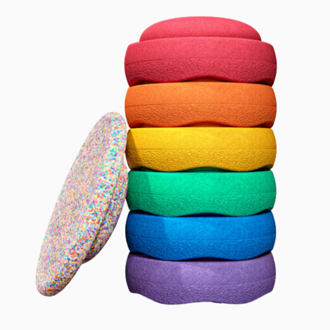 - Inhoud: 6 stapstenen in regenboogkleuren en 1 balansbord Super Confetti
