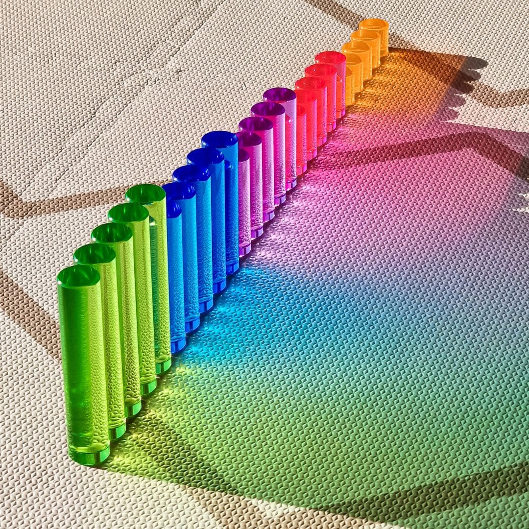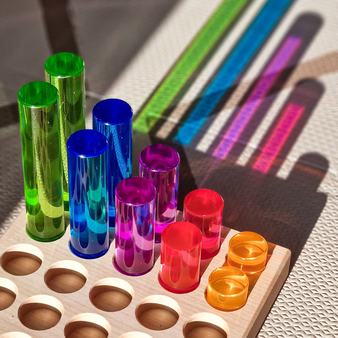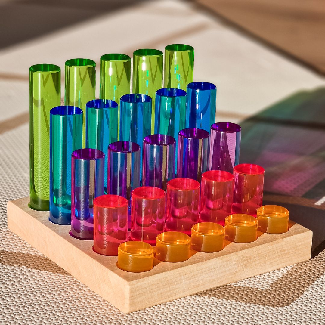 De lichtdoorlatende trap van Bauspiel is heel handig om mee te leren sorteren en rekenen. De cilinders zijn er in vijf verschillende kleuren en vijf verschillende hoogtes. Tip! Zet de blokken voor een raam als de zon schijnt. De reflectie op zal magisch mooi zijn voor kinderen.