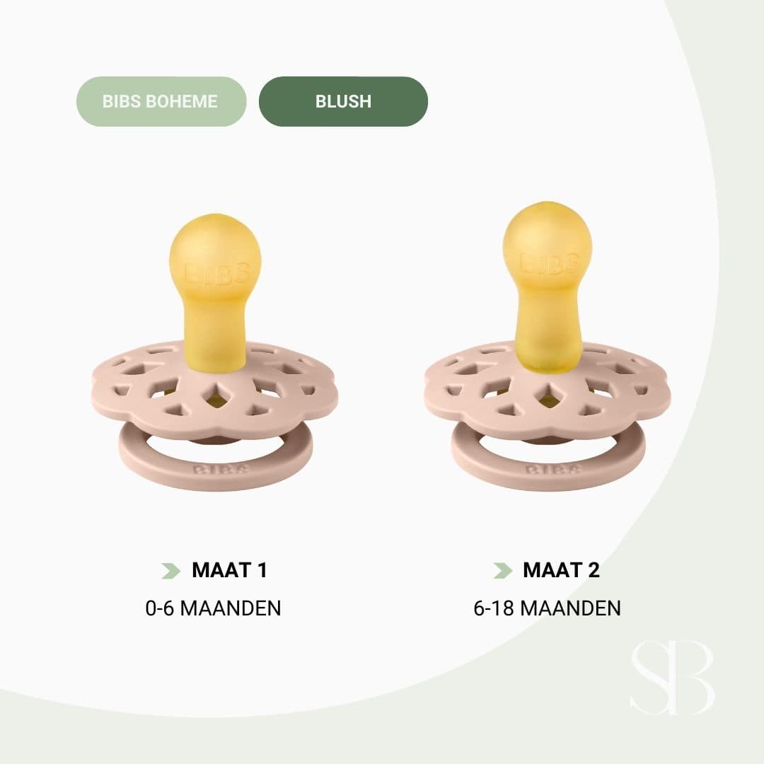 De BIBS Boheme fopspenen zijn verkrijgbaar in twee maten;