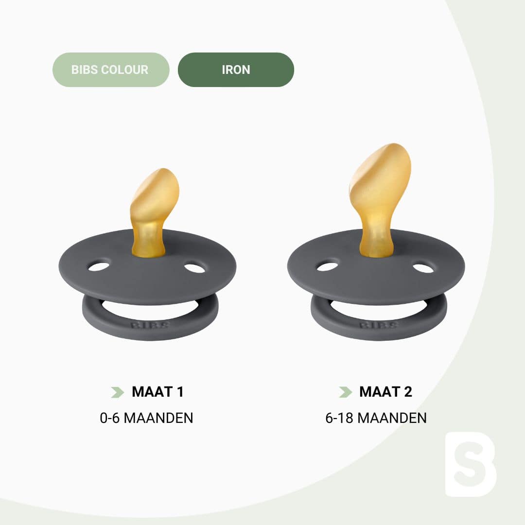 De BIBS Colour dental speen bevredigt de zuigbehoefte van je kindje, biedt troost en kalmeert. De anatomische BIBS speen stimuleert de ontwikkeling van het gehemelte en de spieren in de mond en kaak van je kindje. De gewelfde bovenkant biedt meer grip, zodat je kindje het speentje beter in het mondje kan houden, zonder hard te hoeven zuigen Deze anatomisch speen in donkergrijze kleur – iron - wordt de nieuwe lievelingsspeen.