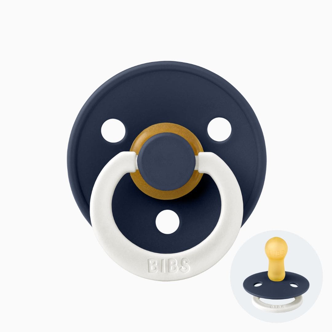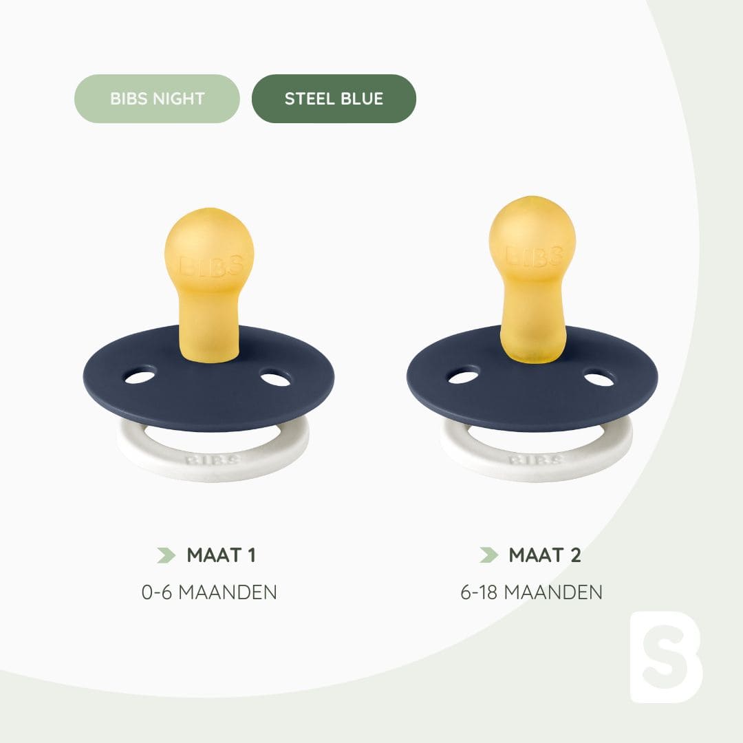 De BIBS Colour night ronde fopspenen zijn verkrijgbaar in drie maten;