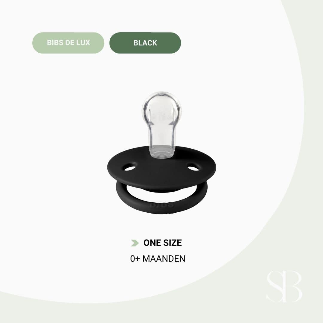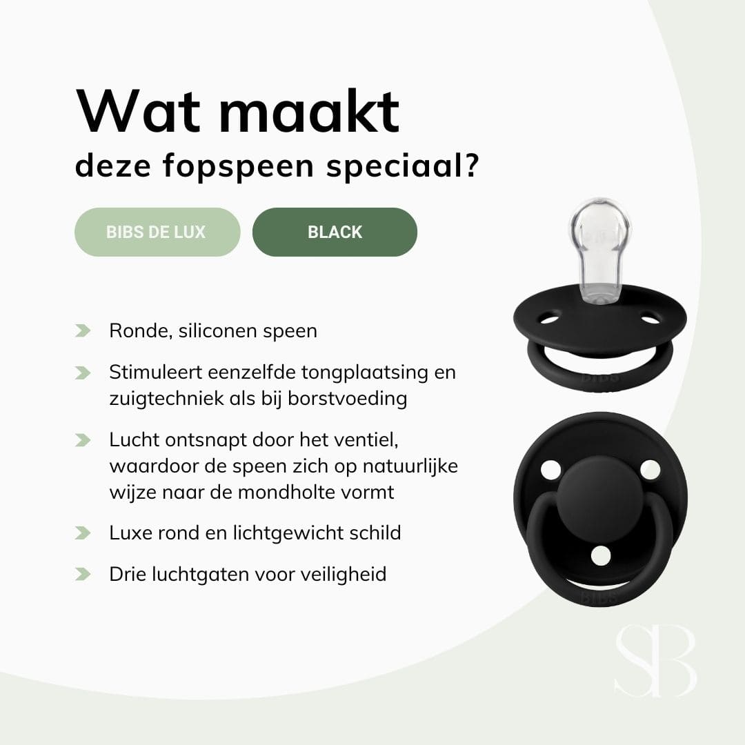 Steel de show met deze premium BIBS De Lux fopspeen in de kleur black. De speen is veilig, comfortabel en hip door de stijlvolle, matte afwerking. De BIBS De Lux speen bevredigt de zuigbehoefte van jouw kleintje, zorgt voor troost en heeft een ontspannende werking.