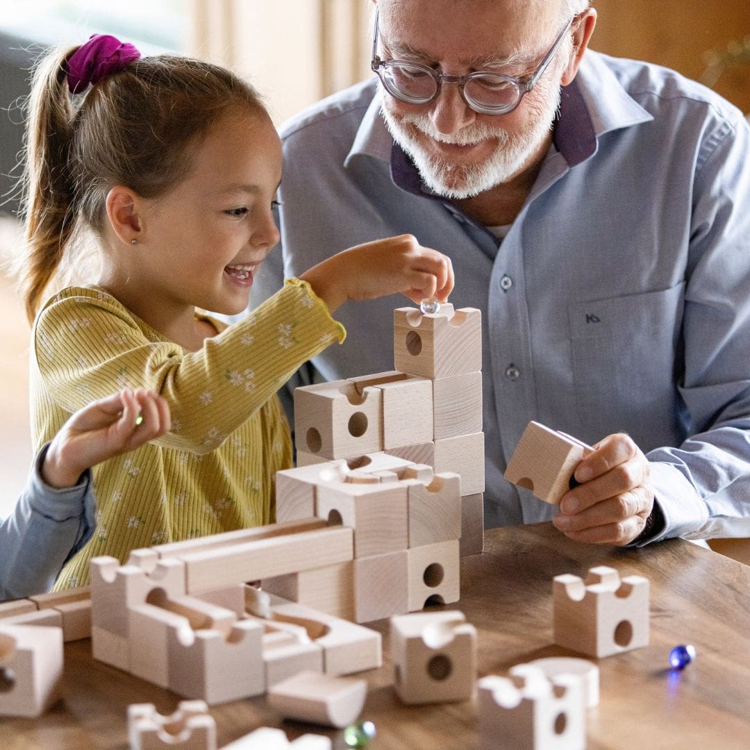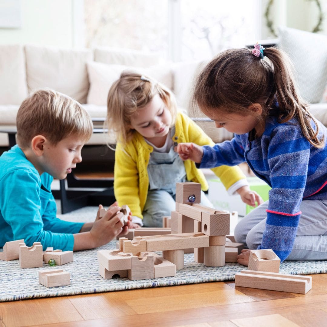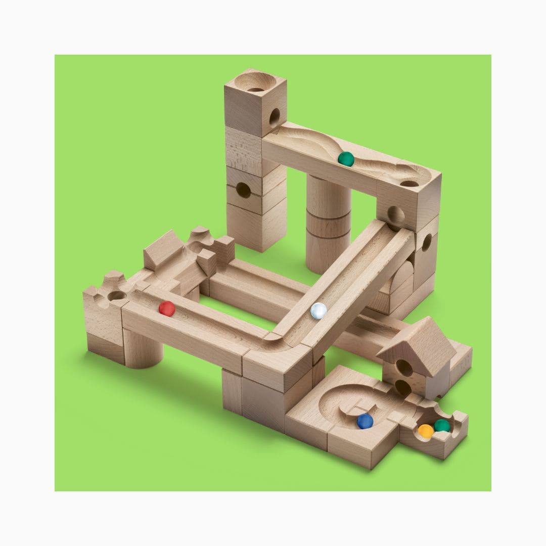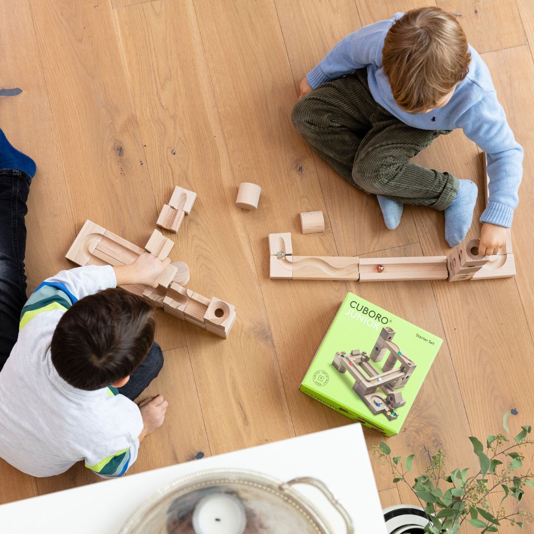 De CUBORO JUNIOR is de perfecte starter set voor kinderen vanaf 3 jaar. Met de houten kubussen en rails maak je de mooiste knikkerbanen. Knikkers die naar beneden rollen en dan ontdekken wat er gebeurt, is fascinerend voor kinderen. De 40 houten elementen dagen jou en je kind uit om logisch na te denken en te experimenteren. Zodra de knikkerbaan eenmaal staat, heb je een waar spektakelstuk staan. Knikkerbaan klaar? Knikkeren maar!
