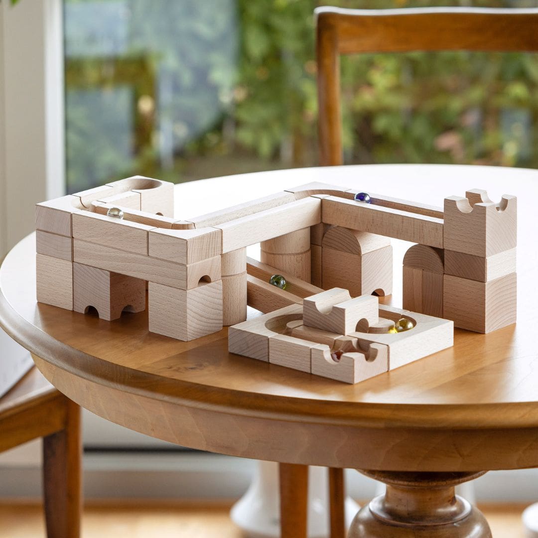 De houten knikkerbaan kun je op talloze manieren neerzetten, waardoor deze nooit hetzelfde is. Super leuk open einde speelgoed! Ook kun je de knikkerbaan goed combineren met andere houten blokken. Laat jullie creativiteit de vrij loop en geniet van het speelplezier!