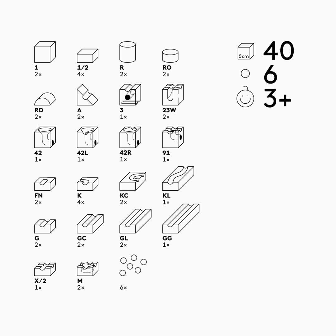 - Inhoud verpakking: 40 blokken en 6 knikkers