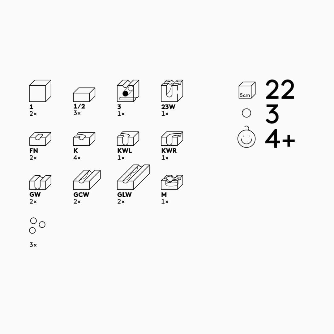 - Inhoud verpakking: 22 bouwelementen en 3 knikkers