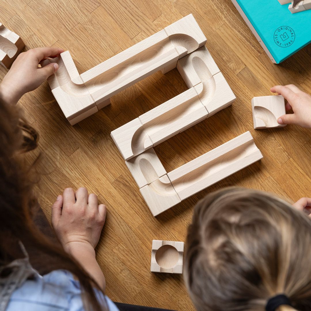 De houten knikkerbaan kun je op talloze manieren neerzetten, waardoor deze nooit hetzelfde is. Zodra de knikkerbaan eenmaal staat, heb je een waar spektakelstuk staan. Super leuk open einde speelgoed dus!