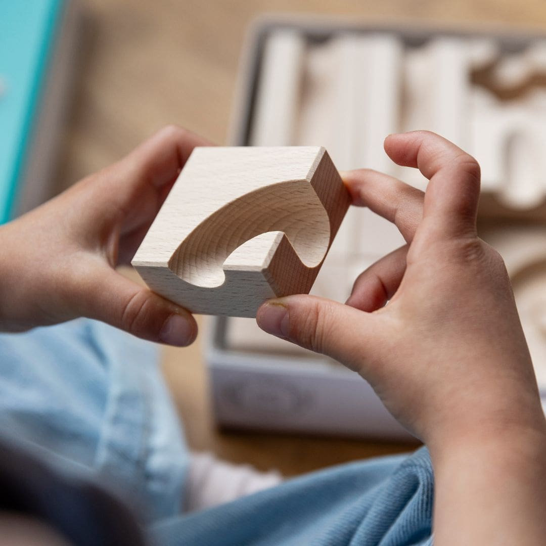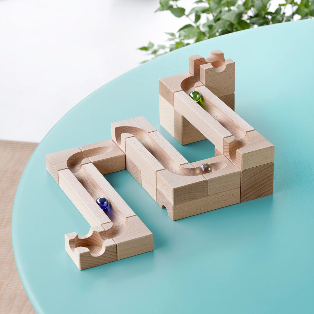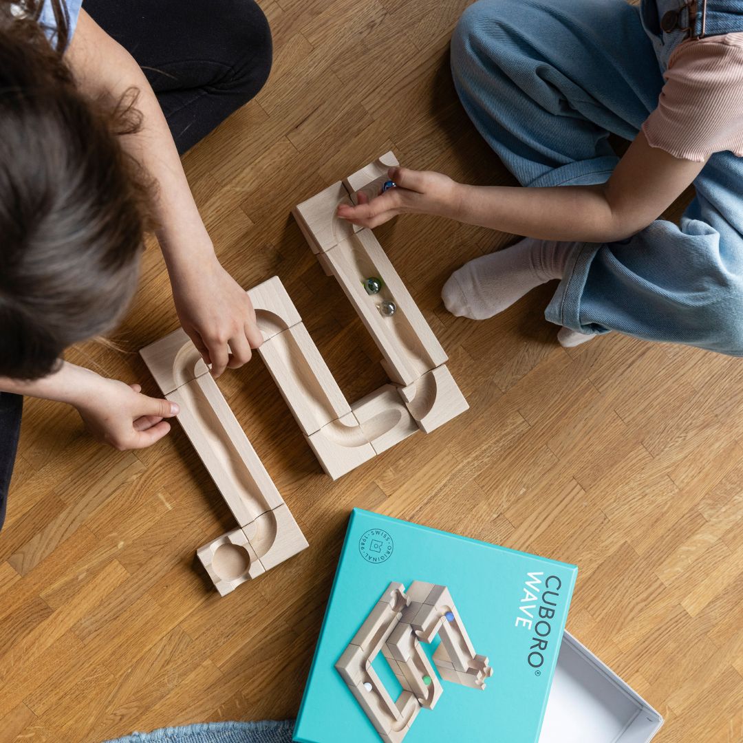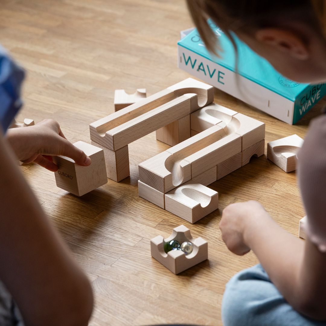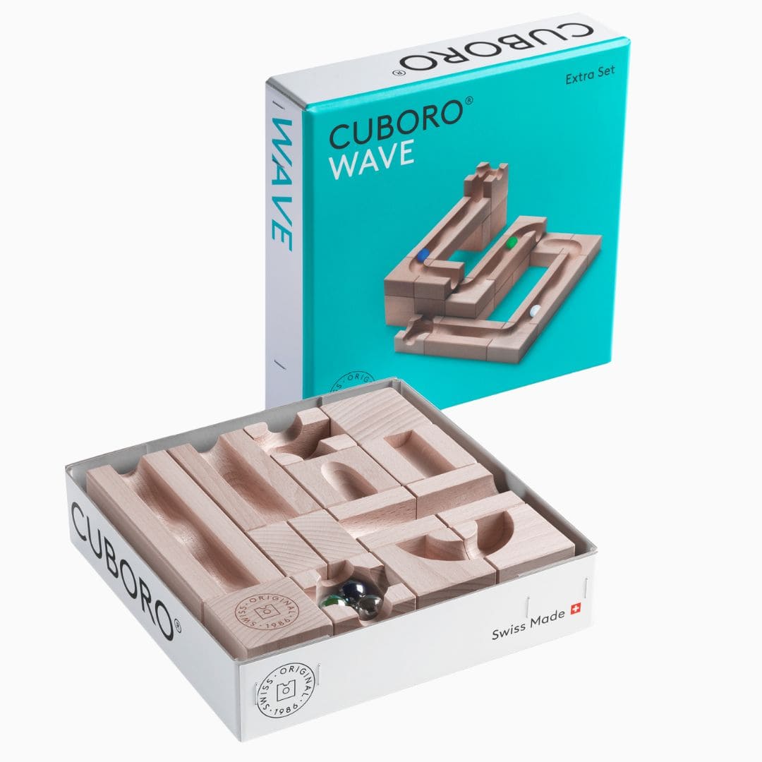De CUBORO WAVE is een fantastische uitbreidingsset voor de houten knikkerbaan. Met deze 22 bouwelementen kun je knikkers laten 'golven' over de baan. Zo gaan de knikkers omhoog en omhoog.