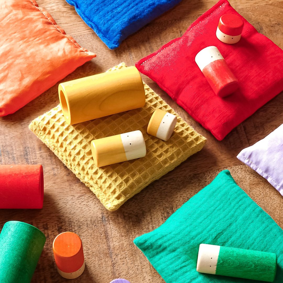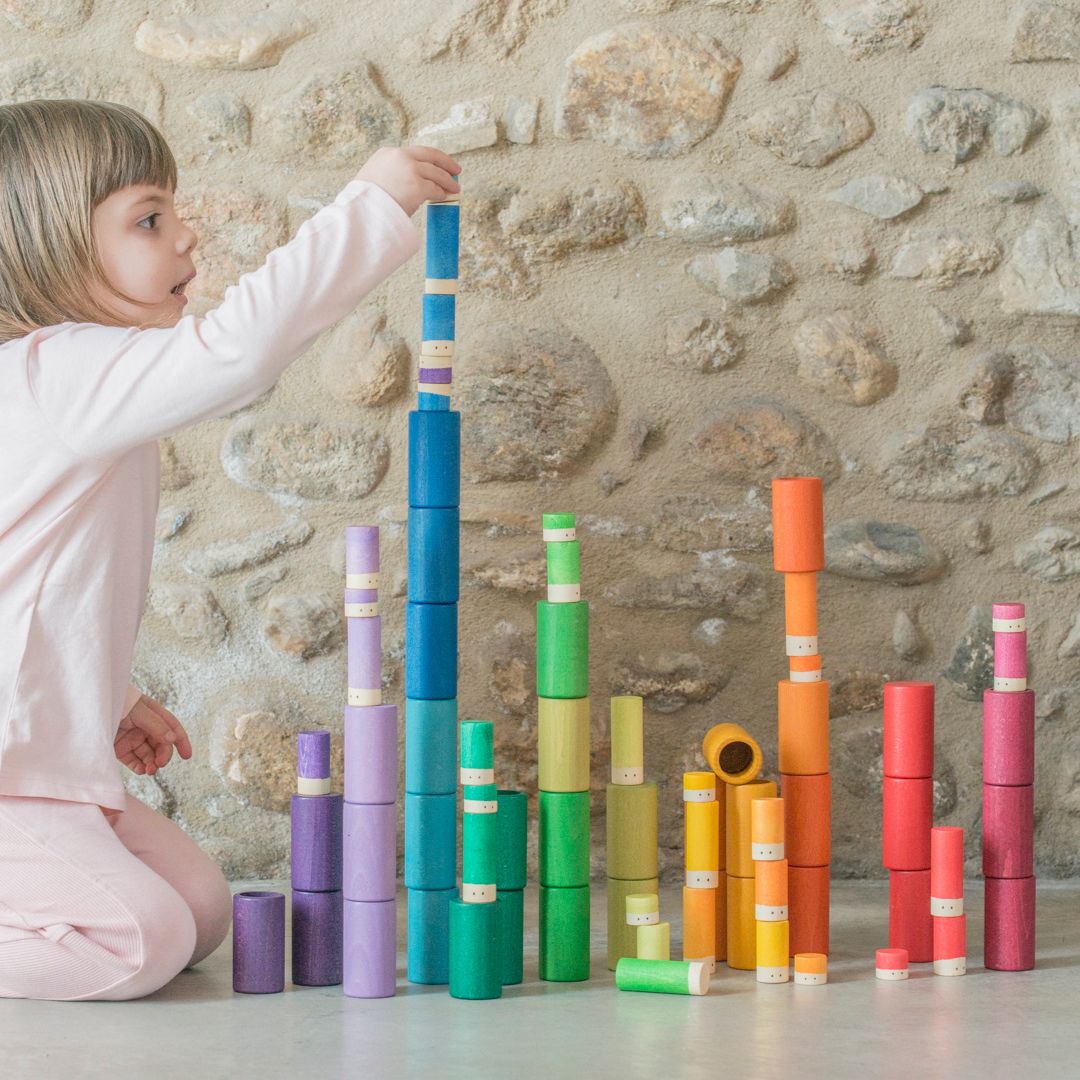 De Lola speelset van Grapat is een veelzijdige set met eindeloos veel speelmogelijkheden. Je kunt de staafjes in de cilinders stoppen, stapelen, sorteren op formaat of kleur, de cilinders rijgen of de materialen gebruiken voor small world play.