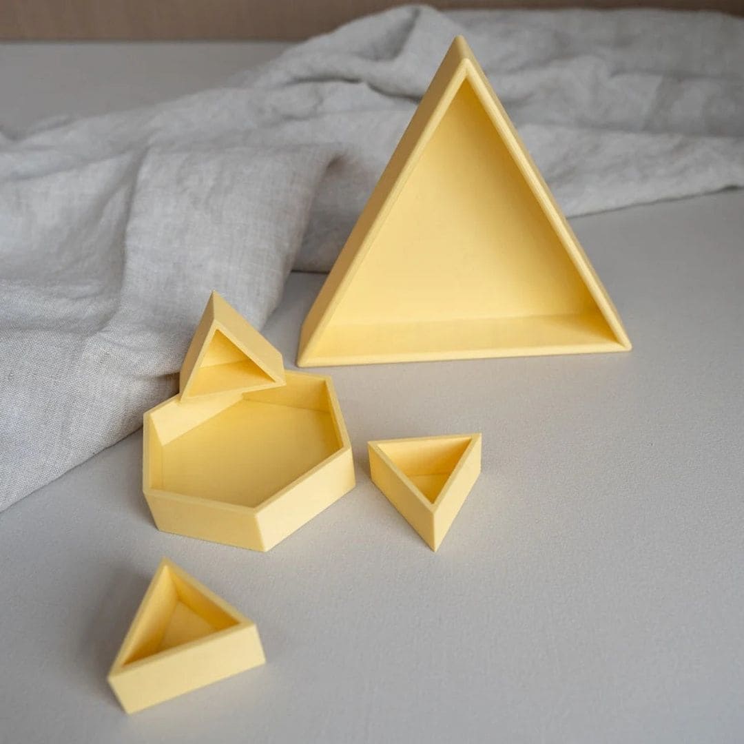 De driehoekige vorm zorgt voor duidelijke, stevige vakjes. Ideaal voor het sorteren van magic sand, speelrijst, kleine accessoires, stekers of mini speelgoed.