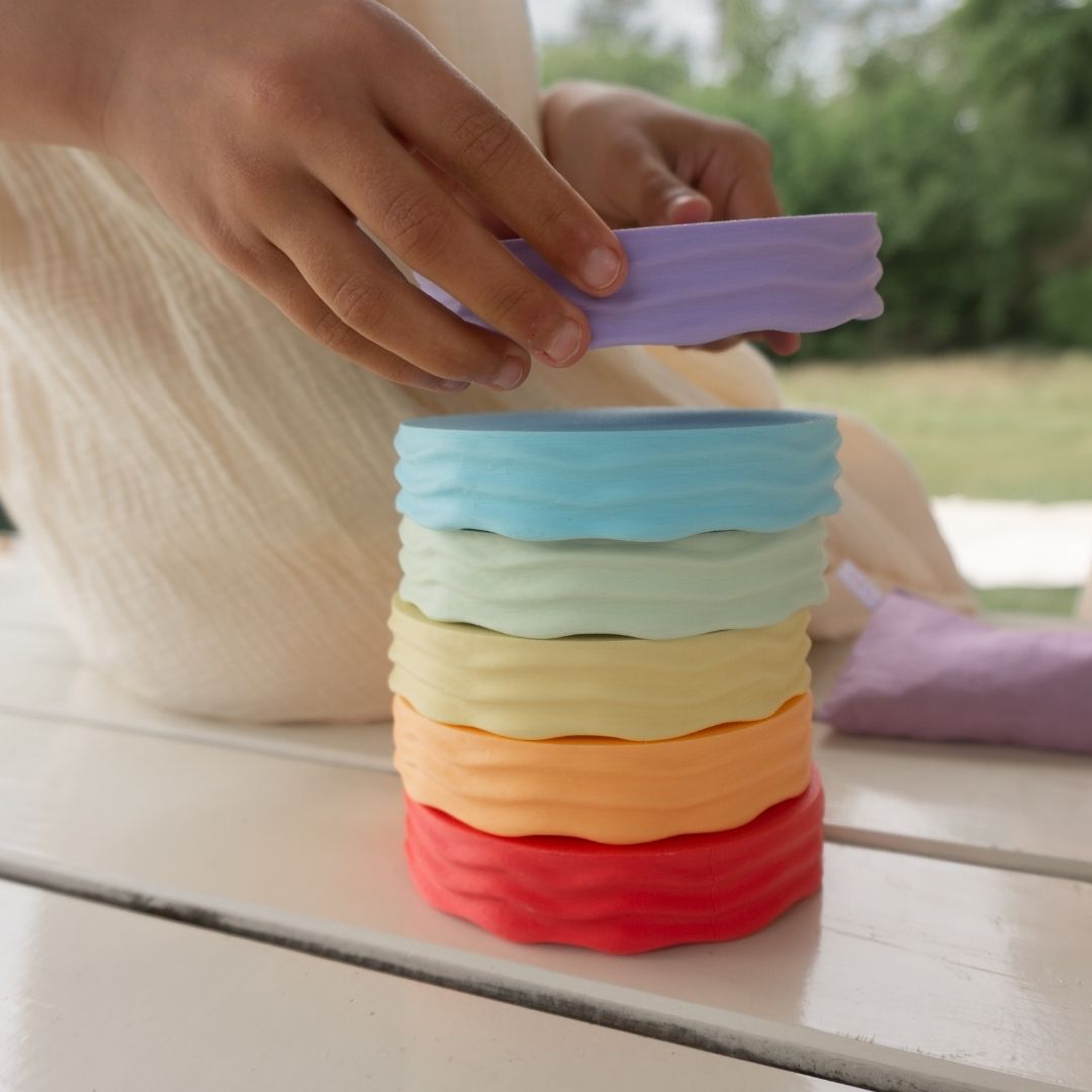 Zes vrolijke speelbakjes, eindeloos veel manieren om te spelen. De Waves speelbakjes in pasteltinten maken sensorisch spel nóg leuker. Vul ze met speelrijst, gebruik ze als mal voor zandtaartjes van kinetisch zand of zet ze neer als doelwit voor pittenzakjes. Je kunt elke keer weer op een andere manier mee spelen.